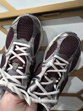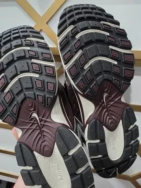 Worn once. Breathable mesh upper in maroon. Silver overlays and reflective accents. Cream midsole with maroon detailing. Black Nike Swoosh with glossy finish. Sporty, cushioned profile.