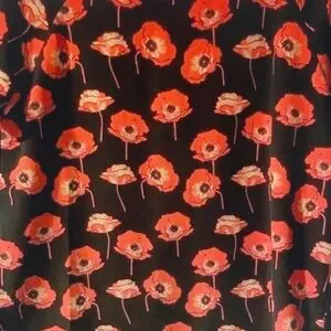 Bold red poppies on a black short sleeve tee. Round neckline and relaxed fit. Lightweight, wearable for everyday styling.