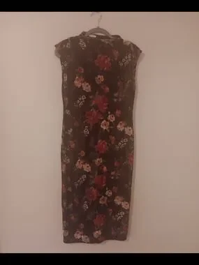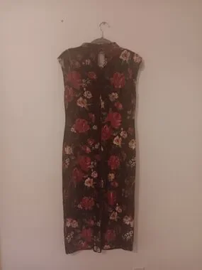 This beautiful sleeveless bodycon dress from Maurices features a red and pink floral pattern against a black background. It has a high neckline with two button closures at the back of the neck.