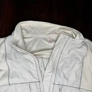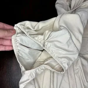 Features: Collared neckline; zip-front closure; elasticated waistband; exaggerated side pockets; defined zig-zag stitching throughout; brethable piecing to keep you cool