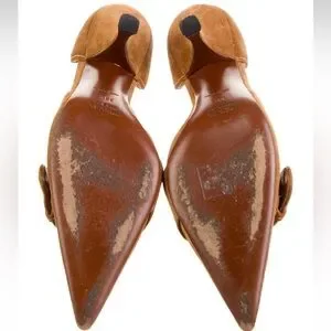 Prada Tan Suede Pointed-Toe D'Orsay Heels with Metal Buckle