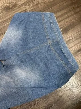 High-rise flare jeans with bold vertical stripes. Features alternating light and medium blue denim panels. Classic five-pocket styling. Statement retro look.