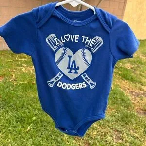 Genuine Merchandise Dodgers bodysuit. Royal blue with white team graphic. Front heart and crossed bats logo. Snap bottom for easy changes. Soft cotton blend fabric.