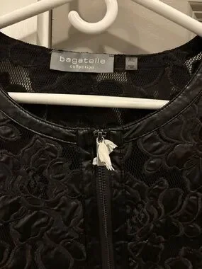 bagatelle black jacket with all-over floral lace overlay. Front zipper closure for easy wear. Long sleeves and round neckline. Delicate textured design adds feminine detail.