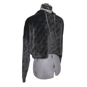 Y2K Juicy Couture velour cropped hoodie featuring an all-over logo embossed pattern and branded drawstrings. This soft black loungewear piece offers a relaxed fit with drop shoulders, perfect for a 2000s aesthetic.