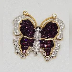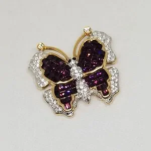Elegant and eye-catching butterfly brooch featuring rich purple rhinestones accented with sparkling clear crystals. This beautifully detailed statement pin is crafted in a gold-tone setting with textured silver-tone wings and a crystal-encrusted body for added dimension and shine.