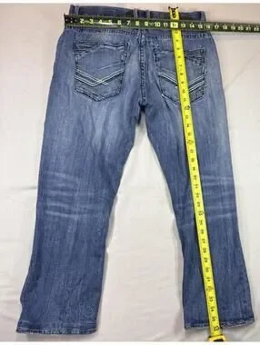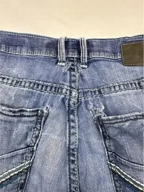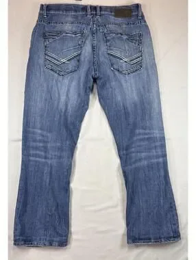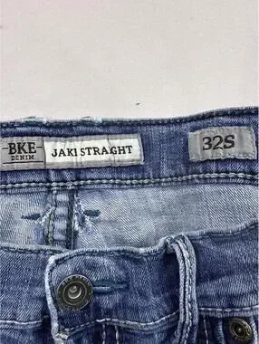 BKE Denim Jaki Straight jeans in size 32S. Classic straight leg fit with a light blue wash and subtle fading. Made from durable denim fabric. Comfortable and versatile for casual wear. some wear