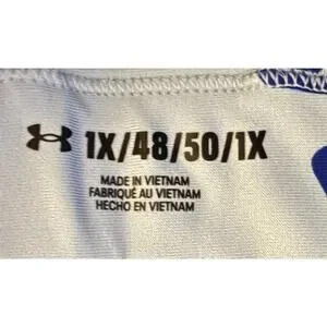 Under Armour high-support sports bra in size 1X featuring a bold white and blue logo print design. This eye-catching piece combines performance and style, making it perfect for workouts, training, or everyday athleisure wear.