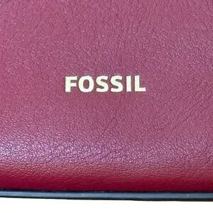 Fossil tote bag crafted from rich burgundy leather with tonal suede side panels. This versatile carryall features a spacious triple-compartment interior with a central zip divider, multiple slip pockets, and a back wall zip pocket for organization. The exterior is accented with the signature brass-tone key charm and gold-foil logo lettering. Drawstring details at the sides allow for a slightly adjustable silhouette, while the slim shoulder straps ensure comfortable wear.