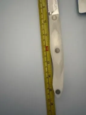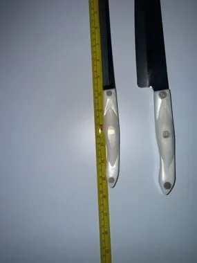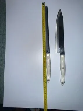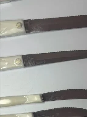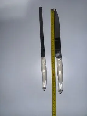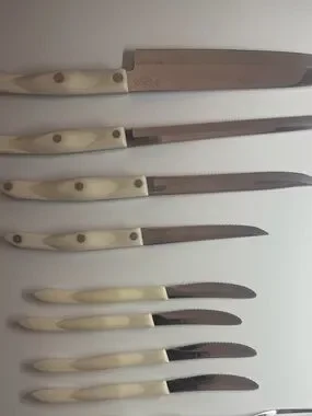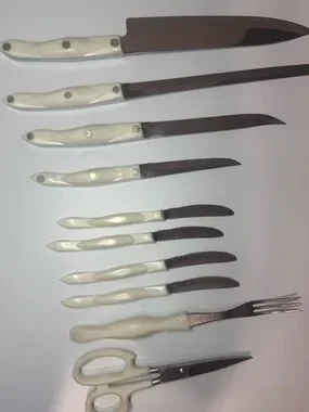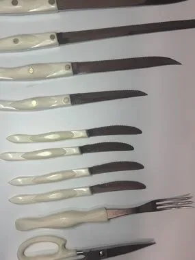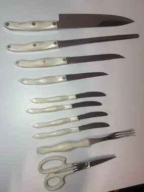 Elegant white pearl-handle knife and scissor set for everyday kitchen tasks. Includes chef knife, bread knife, utility knives, steak knives, carving fork and kitchen scissors. Comfortable white handles for a secure grip. Durable stainless blades deliver reliable cutting performance. Stylish, easy-to-clean design that complements modern kitchens.