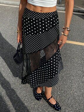Black Casual Women's Elegant Polka Dot Print Contrast Lace Skirt
