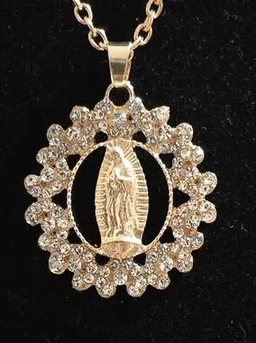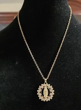 Elegant gold-tone pendant featuring a Virgin Mary motif surrounded by crystal accents. Shiny gold chain completes the look. A refined accessory that adds faith-inspired elegance to any outfit.