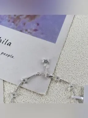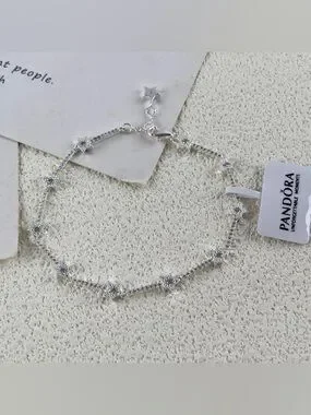 Delicate Pandora bracelet featuring tiny star accents. Polished silver chain with sparkling details. Secure lobster clasp with small star charm. Elegant and feminine accessory for daily wear.