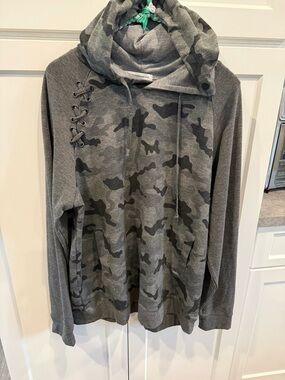 Casual gray pullover hoodie with braided accent. Green and white braided drawcord adds visual interest. Soft knit fabric for everyday wear. Simple, versatile style.