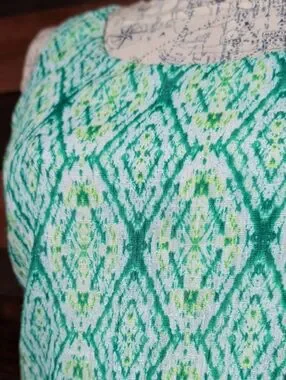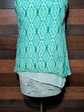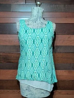Lightweight sleeveless camisole with geometric pattern. Scoop neckline and relaxed silhouette. Vibrant green tones add a fresh look. Easy to layer for casual outfits.