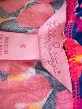 Bold neon floral print wide-leg pants by Lilly Pulitzer. Lightweight, flowy fabric for easy movement. Elastic waistband for comfortable wear. Bright palette ideal for summer and resort looks.
