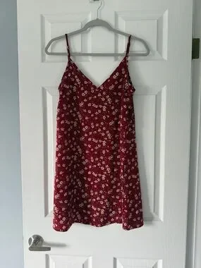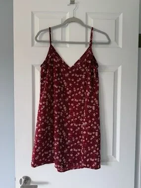 Lightweight floral mini dress with thin straps. V-neckline and A-line skirt. Soft, flowy fabric for casual wear. Pretty ditsy flower print.