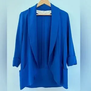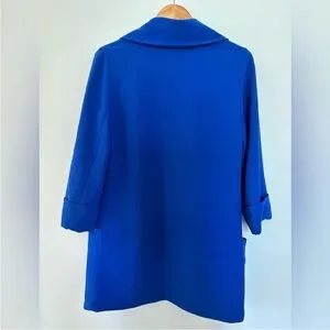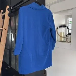 Nine o’clock, five o’clock, whenever. This is a tuxedo-inspired, open blazer with tacked three-quarter length sleeves. It’s made with innovative double cloth crape from Japan with nice weight. Easy to match, style and made for all seasons.
