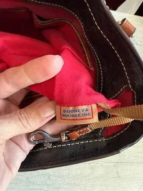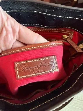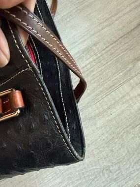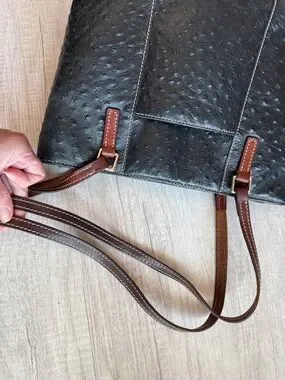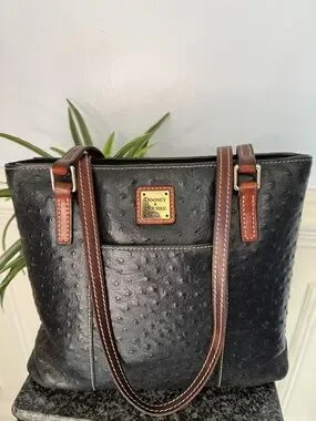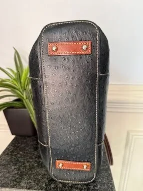 Dooney & Bourke Lexington Black Ostrich Style Leather Brown Trim Tote Bag