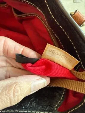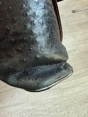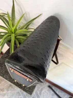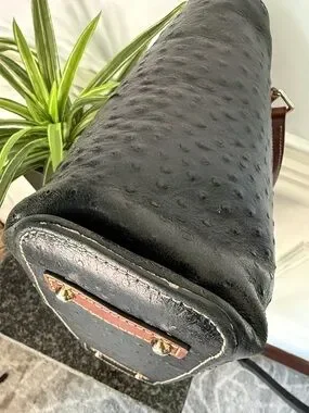 In good used condition. Beautiful black ostrich, leather style leather bag with natural saddle brown leather trim. Feet at the bottom of the purse. Two outside pockets and multiple inside side pockets. Attached key strap inside as well as a top zipper closure. Two strap handles. Measurements are 12 inches long and 4 inches wide at the bottom. Bag height is 10 inches and strap drop is 12 inches. Please note that this is a used bag and I have tried to picture a good representation of the wear. Straps are a bit darker due to use however, they are in very good condition. Some of the piping has come off from around the top and base however, it is not super noticeable as it is dark underneath. Lighting is the traditional red fabric and does show signs of use. No rips inside.