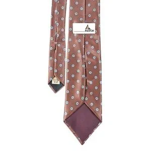 Lightweight polyester tie with repeating blue and white medallion pattern. Made in USA with domestic fabric.