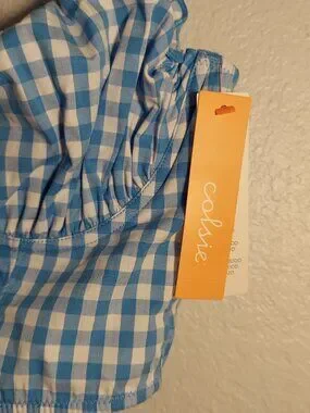 Embrace the coquette and picnic-chic aesthetic with this adorable Colsie blue and white gingham bustier crop top. New with tags (NWT), this top features a structured, corset-inspired silhouette with underwire-style stitching and feminine ruffle trim along the neckline.