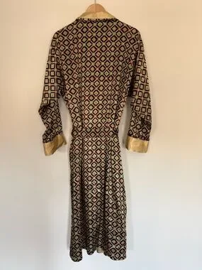 Soft silk-blend robe with a geometric pattern. Contrasting gold trim on collar and cuffs. Wrap tie closure for a customizable fit. Lightweight and elegant for lounging or sleepwear.