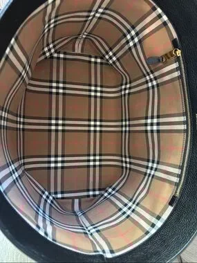 Black pebbled leather exterior with top handles. Features gold-tone zipper and hardware. Interior lined in Burberry beige plaid. Classic branded interior pattern.