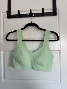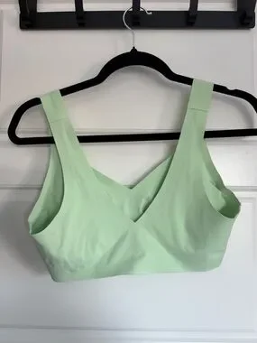 Smooth wireless bralette in a soft mint green. Wide straps and a V-neck silhouette. Seamless finish for low-profile wear. Stretch fabric for gentle support and comfort.