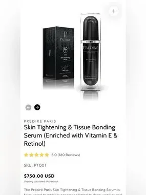 Elegant black serum in a clear pump bottle. Labeled Prédiré. Skin Tightening Serum formula. Sleek, modern packaging. Great for display or gifting. NEW!!!