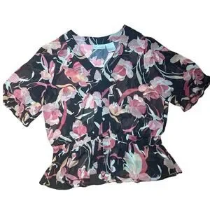 Worthington black sheer floral peplum blouse with a V-neck and short sleeves, feature a fitted waist that flares out at the hip, lightweight polyester.