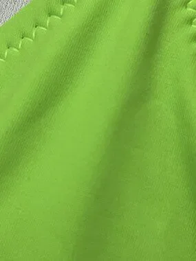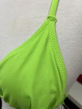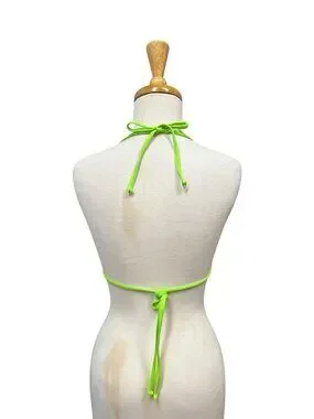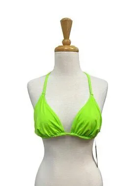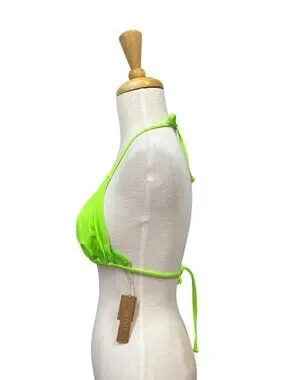 SKIMS triangle bikini top in vibrant neon lime. Adjustable halter straps. Soft, stretchy swim fabric. Simple, minimal silhouette. Bold, eye-catching color.