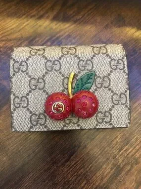 Gucci card holder in beige GG monogram canvas. Features a red jeweled cherry applique with green leather leaf and gold stem. Compact design with signature logo detail. Playful yet luxurious accent.