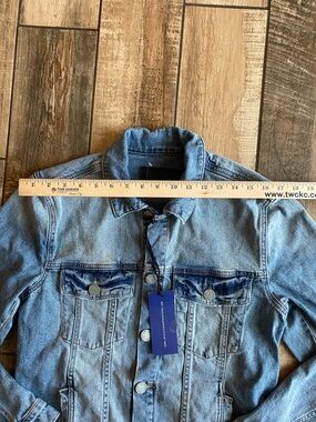 Light blue denim jacket with classic trucker styling. Button-front closure and chest flap pockets. Subtle seam detailing for a tailored look. Easy layering piece for casual outfits.