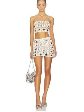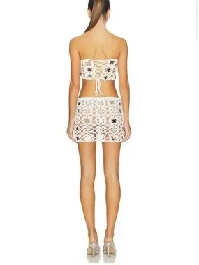 Two-piece lace cutout set by REVOLVE. Strapless bandeau top. High-rise mini skirt with matching floral cutouts. Lightweight and airy feel. Flirty, figure-skimming silhouette.