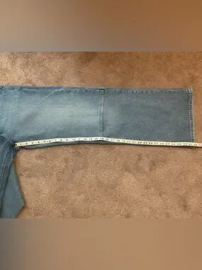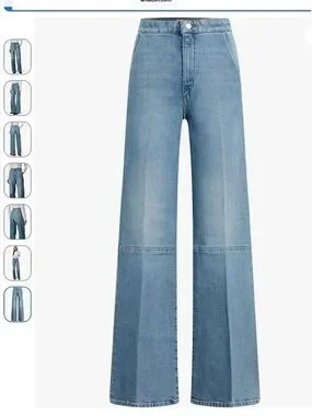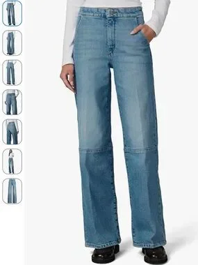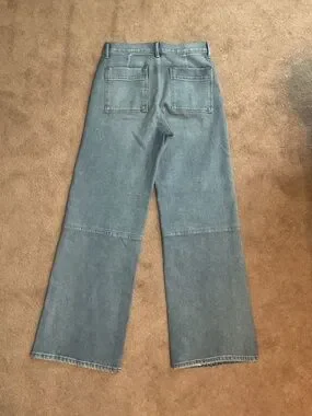Light blue wide-leg jeans with a subtle two-tone knee panel. High-rise waist and relaxed fit through the hips. Clean front pockets and minimal detailing. Casual, modern silhouette for everyday wear.