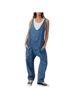 Loose, relaxed silhouette with a deep scoop front. Washed denim fabric with visible seam detailing. Large front pockets and roomy legs for easy movement. Adjustable straps and a casual, laid-back vibe.