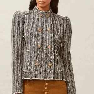 Tory Burch Sammy Herringbone Tweed Raw Edge Double Breasted Wool Blend Jacket