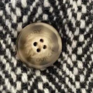 White/black tweed wool blend Sammy herringbone jacket from TORY BURCH featuring raw edge, herringbone pattern, stand-up collar, double-breasted button fastening, long sleeves, logo buttons and two front patch pockets. Shoulder pads to create the defined shoulder. Wear fully button or open up front and button military style.