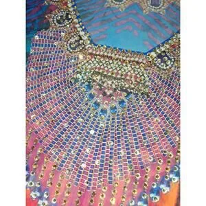 Embellishments: The neckline is heavily detailed with rhinestones and studs, creating a statement "bib" effect.