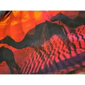 Design: A vibrant, digital print featuring a sunset scene with palm trees and a camel, accented by geometric and animal-print patterns.