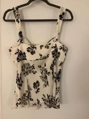 Ann Taylor camisole in a cream base with black and olive floral print. Features a ruched bust and center tie. Wide straps for comfortable wear. Versatile for day or evening styling.