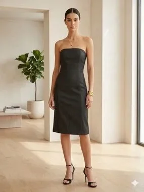 Sophisticated strapless sheath dress in charcoal gray. Slim, tailored silhouette flatters the waist and hips. Clean lines and minimalist design create an elegant, modern look. Perfect for work to evening events and cocktail occasions.