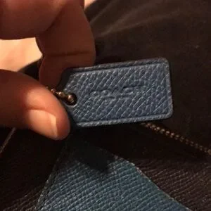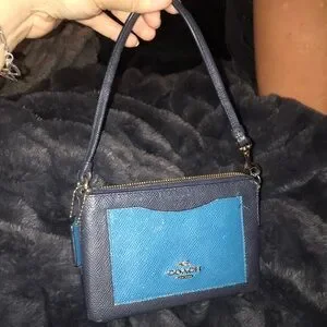 Coach zip card case with exterior card slot. Gold-tone logo hardware on front. Compact and stylish. Navy body with teal pocket. Zipper closure.