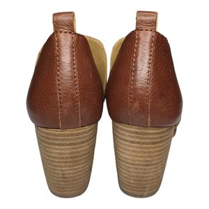Stylish open-toe ankle booties by Lucky Brand. Smooth leather upper with cutout sides. Stacked block heel for stable wear. Slip-on design with heel tab for easy on. Versatile brown tone pairs with many outfits.