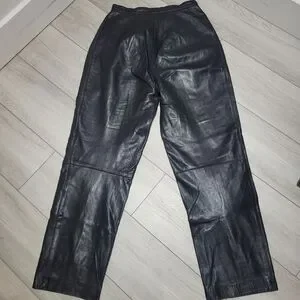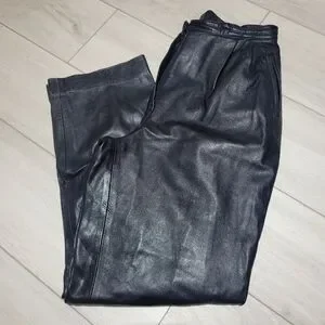 Add bold vintage flair to your wardrobe with these Rumors & Gossip genuine leather pants. Crafted from high-quality black leather, these classic trousers feature a high-rise waist, pleated front detailing, and a tapered leg for a structured yet flattering silhouette. Timeless and edgy, they’re perfect for pairing with heels or boots for a chic, standout look.