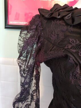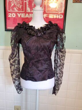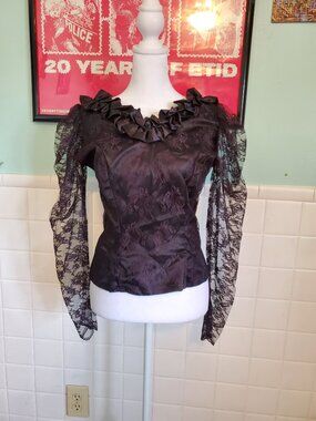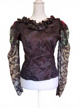 Vintage 80s Black Floral Lace Whimsigoth Long Sleeve Blouse Top Size Small