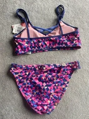 Two-piece girls swim set with colorful geometric print. Features adjustable shoulder straps and contrast trim. Bright pink and blue palette with fun triangular pattern.