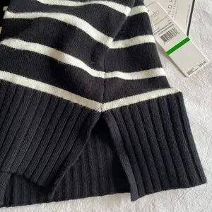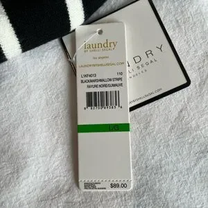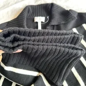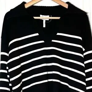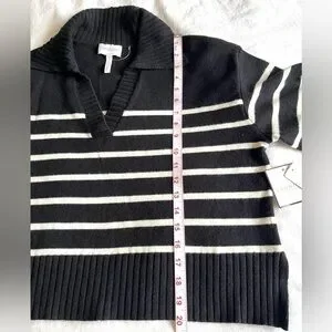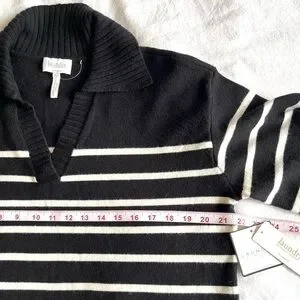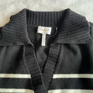 Laundry by Shelli Segal black and white knit polo sweater. Features a V-neck and collared neckline in a soft viscose blend.