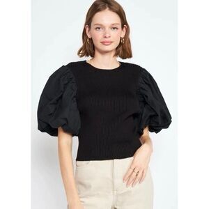 Chic and statement-making En Saison black blouse featuring a ribbed knit body and dramatic puff sleeves in crisp woven fabric. The standout open-back design ties at the waist for a flattering fit, adding a touch of allure. Crew neckline, short voluminous sleeves, and a slightly cropped silhouette make it perfect for pairing with high-waisted jeans, skirts, or tailored trousers. Effortlessly transitions from day to night.